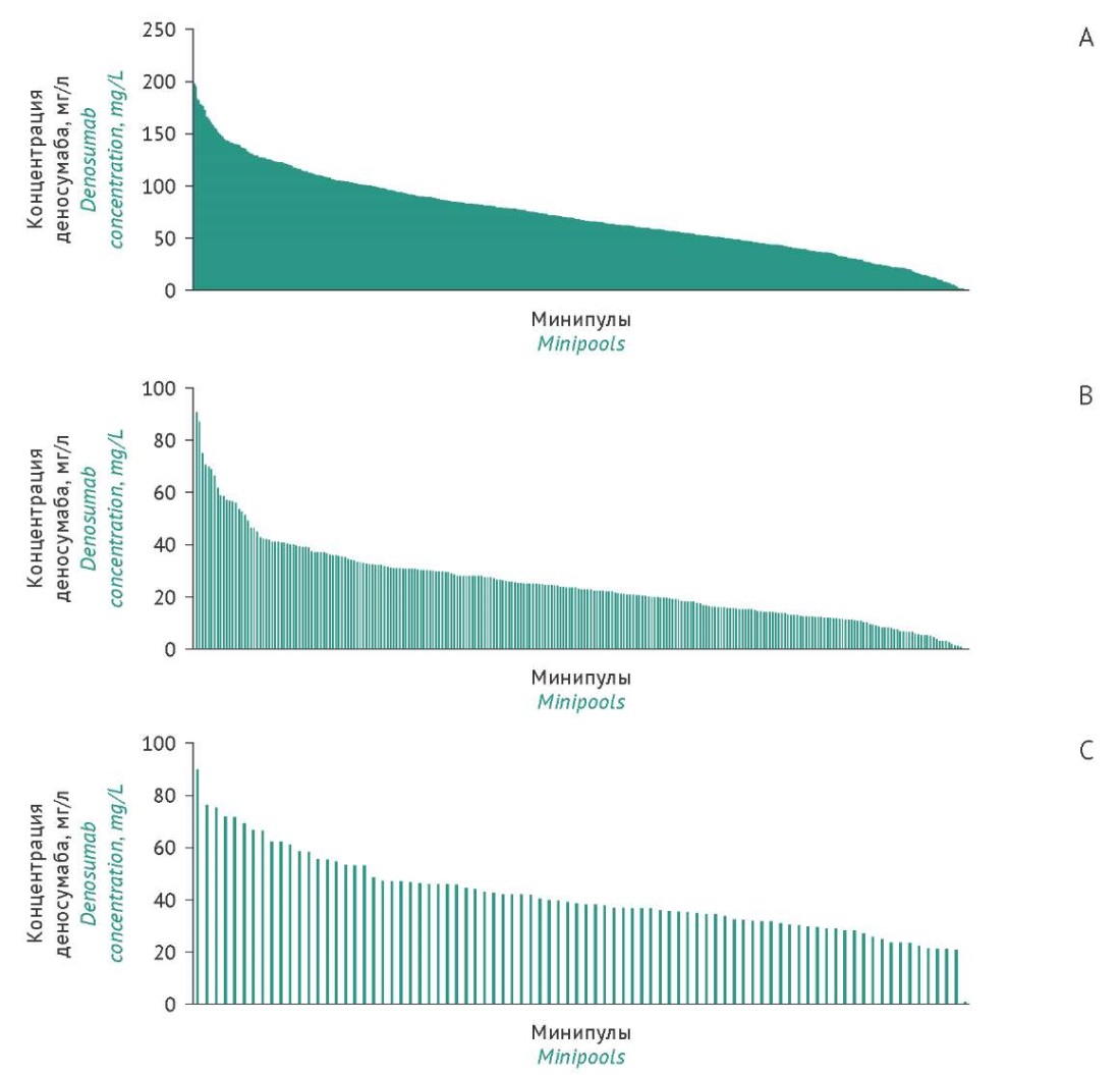 Рис. 2. Распределение минипулов-продуцентов по концентрации целевого белка (деносумаб) в культуральной жидкости при культивировании в планшетах: А — 96-луночные планшеты (1041 минипул); В — 24-луночные планшеты (240 минипулов); С — 6-луночные планшеты (88 минипулов).