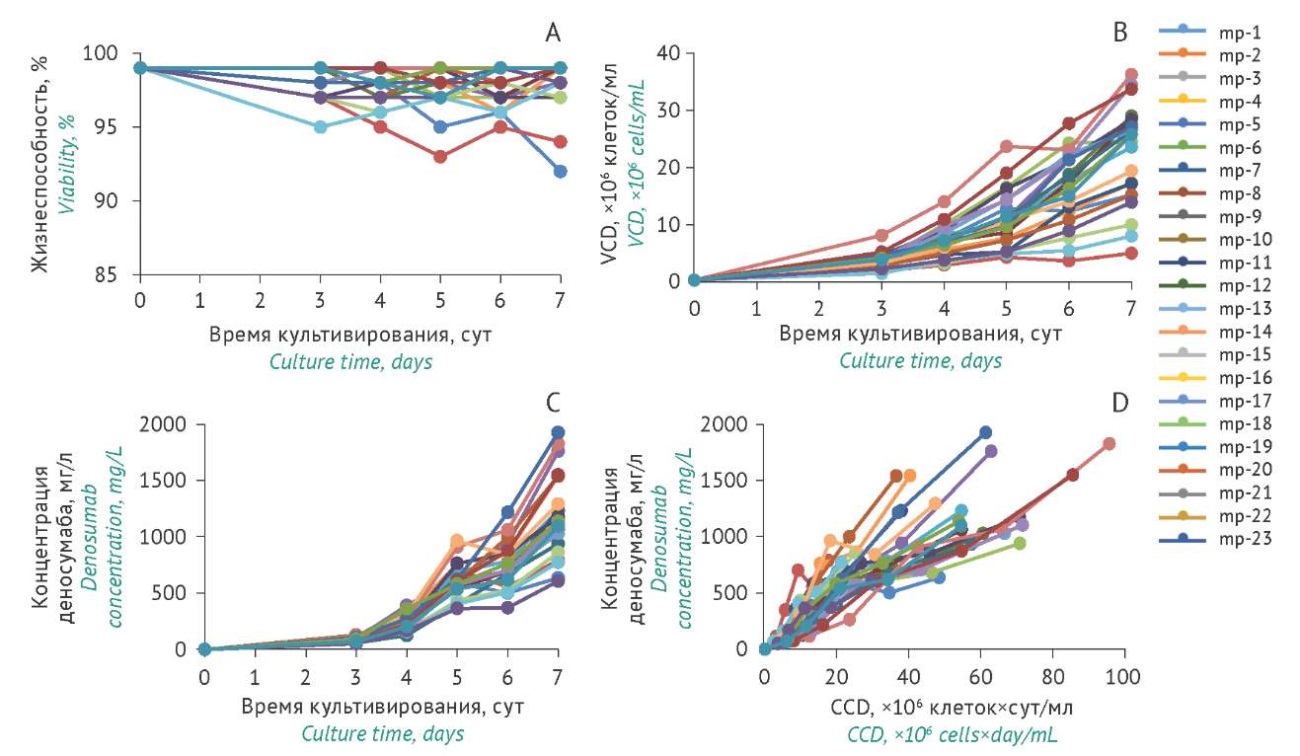 Рис. 3. Характеристика минипулов-продуцентов деносумаба во время культивирования в течение 7 сут: А — жизнеспособность клеток; В — концентрация жизнеспособных клеток (VCD); С — продуктивность клеток; D — зависимость кумулятивной клеточной плотности (CCD) от продуктивности. mp — минипулы-продуценты деносумаба.