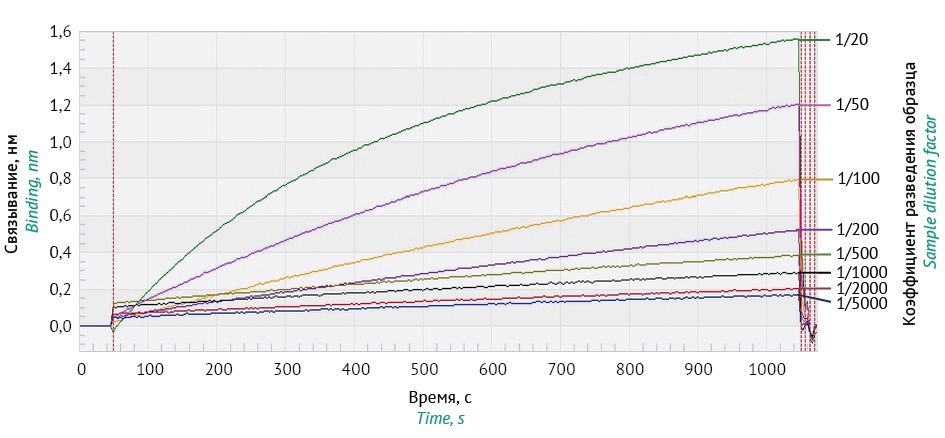 Рис. 1. Типовая сенсограмма взаимодействия поликлональных кроличьих антител к ромиплостиму в разных разведениях исходного образца (50 мкг/мл) с иммобилизованным на стрептавидиновых биосенсорах ромиплостимом.