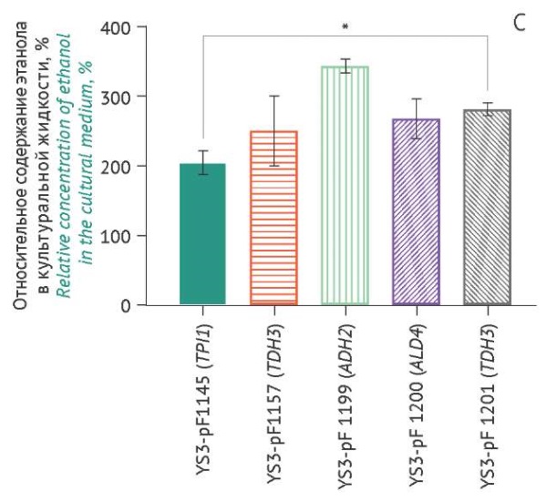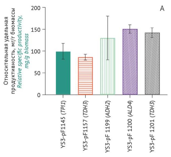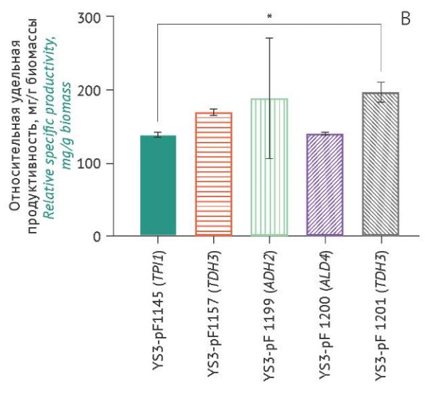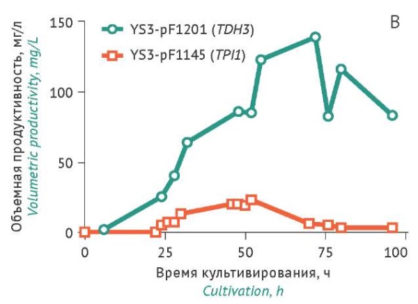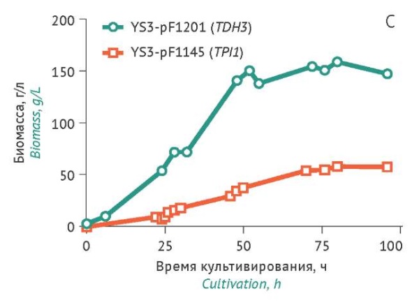 Таким образом, для дальнейшей работы был выбран штамм YS3/pF1201 (TDH3) по причине его высокой продуктивности и благоприятной динамики накопления биомассы. Штамм YS3/pF1200 (ALD4) характеризовался не меньшей продуктивностью, но низким уровнем накопления биомассы.