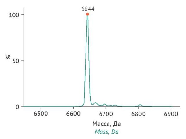 Определение молекулярной массы рекомбинантного проинсулина в культуральной жидкости проводили методом ВЭЖХ-МС, используя систему Acquity UPLC (Waters, США) с масс-спектрометрическим детектором. Разделение компонентов проводили на колонке SunFire™ C18 (5 мкм, 150×4,6 мм) (Waters, США) с регистрацией сигнала при длине волны 214 нм.