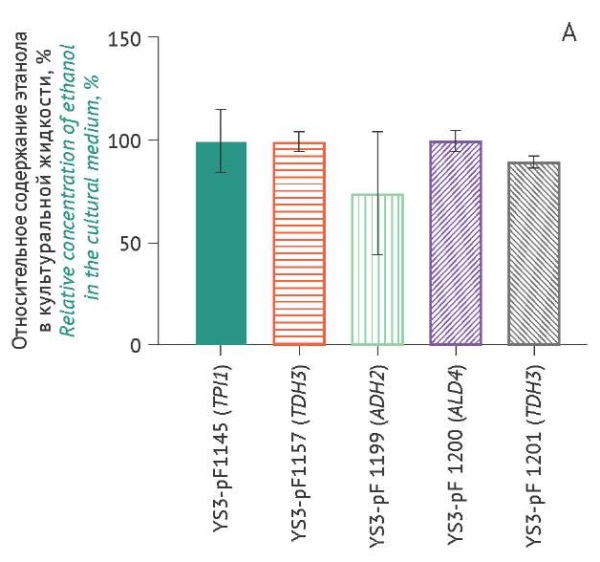 Практически все штаммы-продуценты (рис. 4) увеличивали содержание этанола в культуральной жидкости. Самые низкие значения содержания этанола через 42 ч культивирования наблюдались для контрольного штамма-продуцента YS3/pF1145 (TPI1), тогда как максимальное накопление этанола было характерно для YS3/pF1199 (ADH2) через 42 ч культивирования и составляло 0,96% (табл. 1). Через 42 ч культивирования содержание этанола составило 0,7–0,8% в случаях остальных штаммов-продуцентов. t-тест показал, что статистически значимых различий между штаммами по накоплению этанола не наблюдалось. Для штамма-продуцента YS3/pF1157 (TEF1) накопление биомассы коррелировало с содержанием этанола в среде (p=0,032).