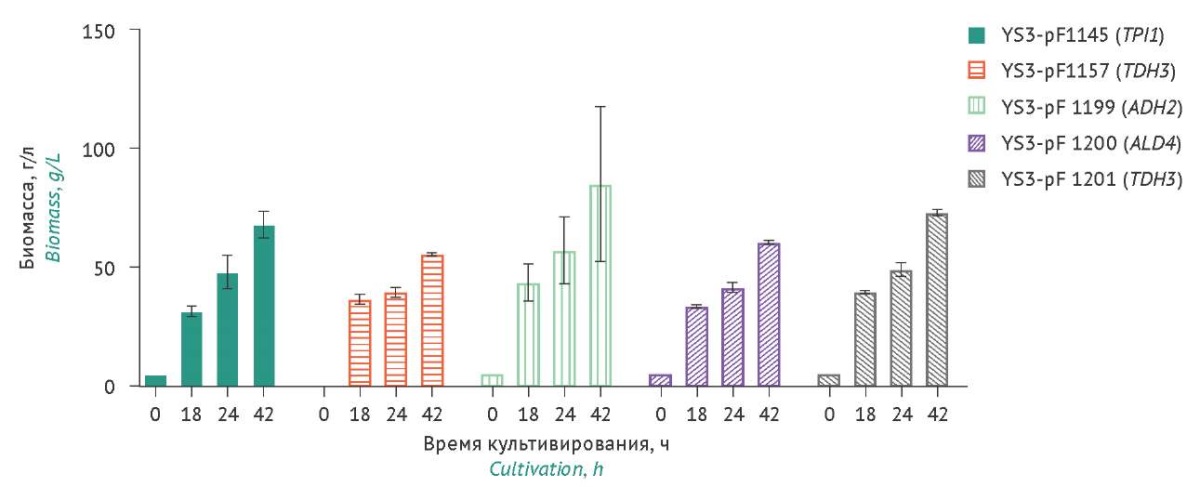 Анализ результатов показал, что все исследуемые штаммы-продуценты демонстрировали схожую динамику роста на протяжении всего процесса культивирования в колбах. Штаммы различались по титру клеток через 42 ч культивирования при одинаковой плотности посева (5 г/л). Штаммы-продуценты YS3/pF1201 (TDH3) и YS3/pF1145 (TPI1) через 42 ч культивирования накапливали биомассу ≈35 г/л; YS3/pF1200 (ALD4) и YS3/pF1157 (TEF1) — ≈30 г/л; YS3/pF1199 (ADH2) — 42 г/л. Значения биомассы штамма-продуцента YS3/pF1199 (ADH2) значительно варьировались в двух точках (24 и 42 ч), что, возможно, связано с некоторой разницей плотности посева клеток.