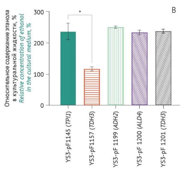 В рамках предварительной оценки полученных штаммов при культивировании в колбах исследовали параметры роста биомассы, накопления этанола и рекомбинантного белка. В качестве контроля использовался штамм YS3/pF1145, экспрессия проинсулина в котором находилась под контролем промотора TPI1. Последовательность данного промотора является «золотым стандартом» для экспрессии рекомбинантных белков в S. cerevisiae [36].