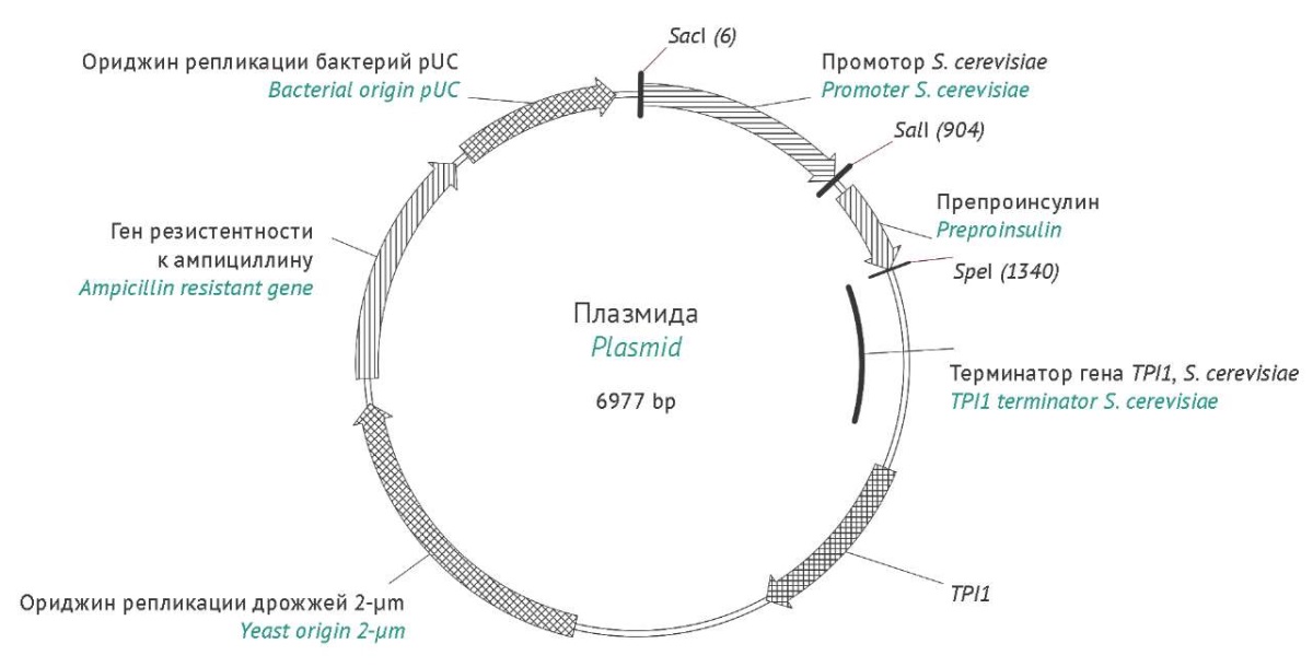В качестве вектора для создания экспрессионных конструкций использовали челночную плазмиду pRS425 (ATCC, США), содержащую маркер устойчивости к ампициллину, а также точки начала репликации (ориджин) pUC и 2-μm (рис. 1). Ген предшественника человеческого инсулина с сигнальным пептидом был синтезирован искусственно (ATUM, США) и клонирован в вектор с использованием рестрикционных сайтов SalI и SpeI. Последовательности промоторов и терминаторов транскрипции были получены синтетическим путем (ATUM, США). Последовательности промотора и терминатора гена TPI1 были клонированы рестрикционно-лигазным методом с использованием рестриктаз SacI и BamHI; последовательность промотора TEF1 — SacI/BglII; ADH2 — BspMI/BglII; ALD4 и TDH3 — SacI/BglII.