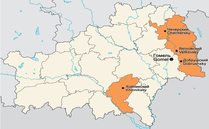 Fig. 1. Map of Gomel region: districts where the screening took place are in dark yellow color.